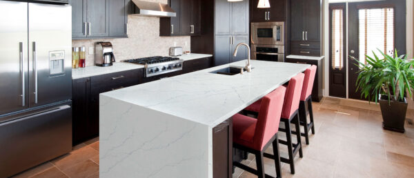 Description: Inspired by the sky, Calacatta Miraggio Cielo features a bright white surface accented by dusky blue-gray veins and silver clouds. As part of the Q Studio collection with LumaLuxe Ultra®, it offers a cool, serene aesthetic that mimics the depth of genuine marble.