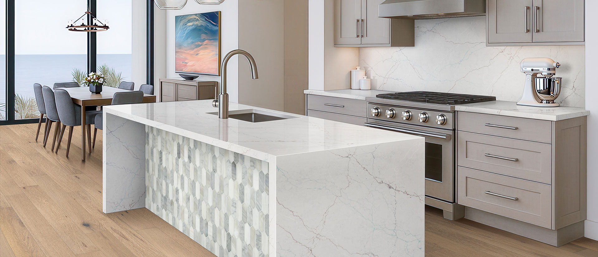 Description: Capture the tranquility of the ocean with Calacatta Miraggio Seaglass. This unique surface features luminous white quartz rippled with veins of sea-green, aqua, and chocolate brown, creating a refreshing coastal vibe enhanced by the depth of LumaLuxe Ultra®.