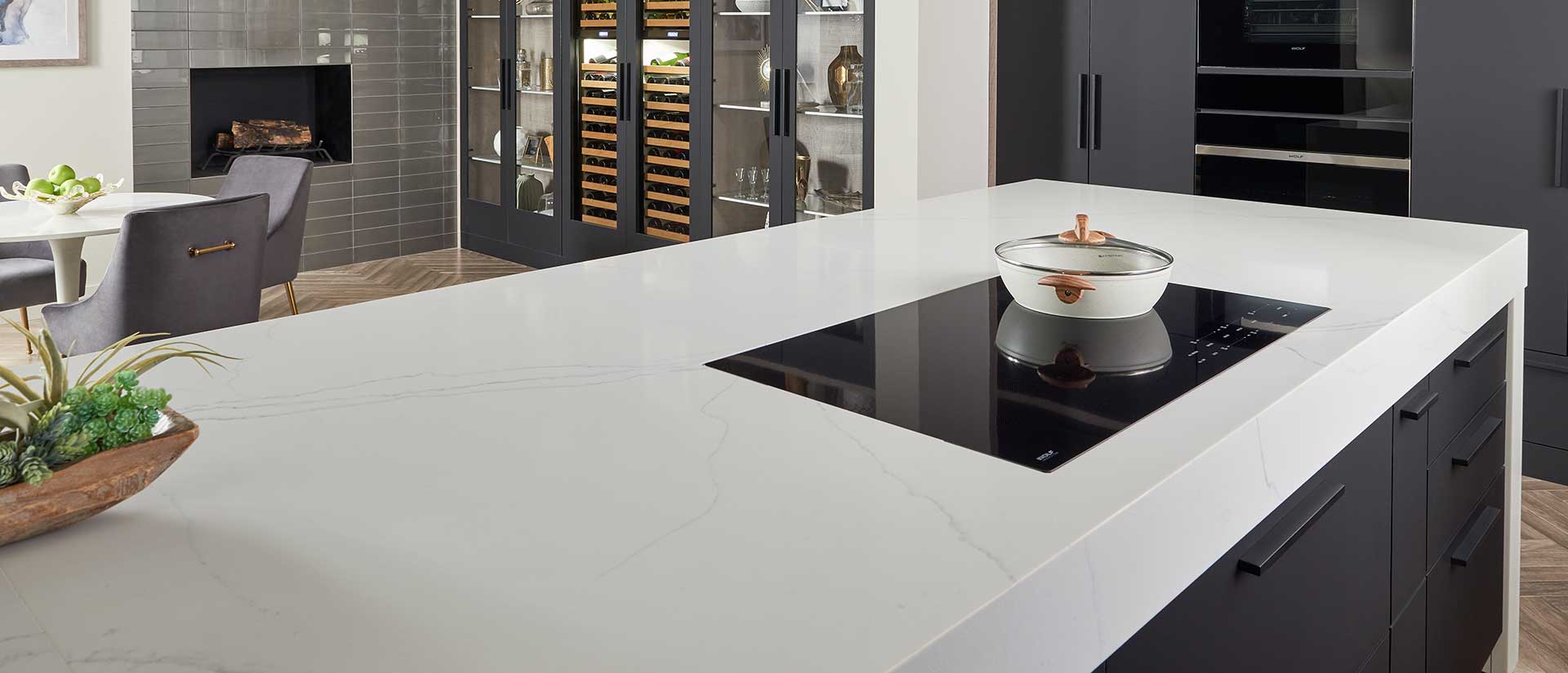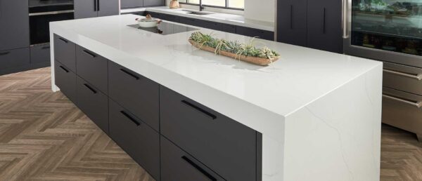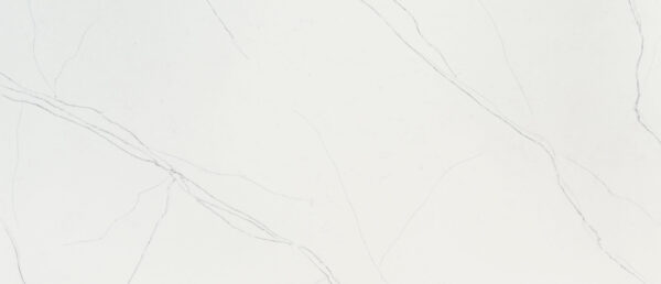 Description: Calacatta Trevi is a clean white quartz featuring long, predominantly linear gray veining. This sleek, structured pattern provides a modern and contemporary look, perfect for designers aiming for simple sophistication.